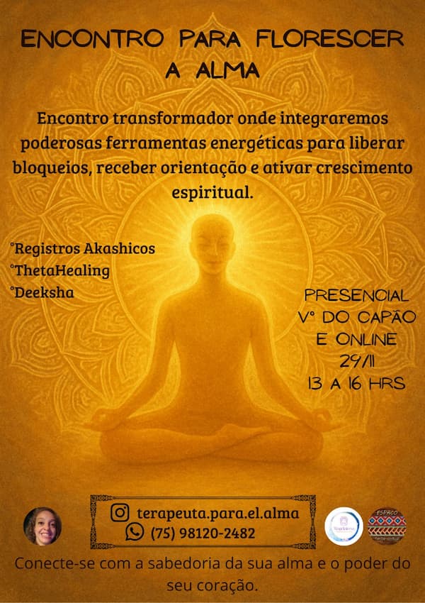 Aproveitando o encerramento do ano 2025 convido você para se juntar a este encontro transformador onde integraremos poderosas ferramentas energéticas para liberar bloqueios, receber orientação e ativar seu potencial de autocura. Conecte-se com a sabedoria da sua alma e o poder do seu coração.