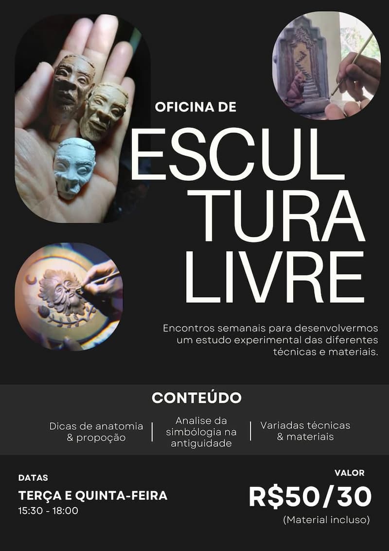 Estaremos nos encontrando para fazer uma experimentação pelos diferentes tipos de materiais para escultura: oil clay, plastilina, argila e gesso, veremos algumas formas de replicar peças resistentes sem necessidade de fornos e abordaremos também tipos de proporção, formas de criar texturas realistas e analisar a simbologia arquetípica das esculturas da antiguidade.