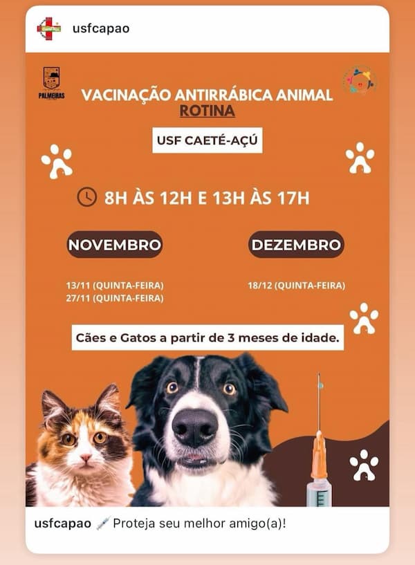 A Vacinação Antirrábica Animal está disponível como ROTINA nas Unidades de Saúde de referência.