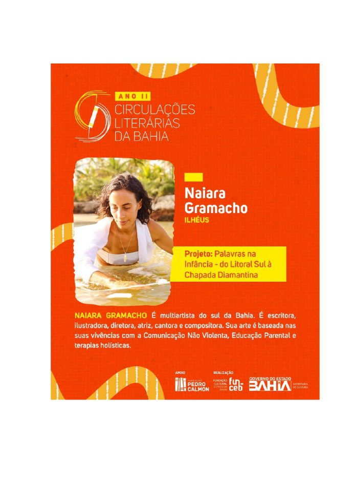 Naiara Gramacho, natural de Itabuna-BA e, atualmente, residente em Ilhéus-BA, contemplada com a proposta “Palavras na Infância – Do Litoral Sul à Chapada Diamantina”, é uma das aprovadas pelo edital. A autora, após participar do FLAP – Festival Literário da APA do Pratigi (Ituberá-BA), em novembro do ano passado, e já ter circulado por Canavieiras, no litoral sul da Bahia, agora chega à Chapada Diamantina.