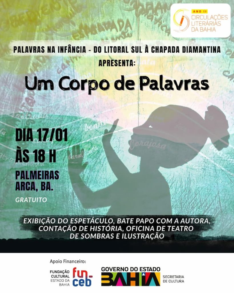 Com os livros “A saudade do sol e da lua” (2022) e “Um Corpo de Palavras” (2025), ambos pela editora Via Litterarum (Ibicaraí-BA), Naiara Gramacho realizará, este mês, atividades pedagógicas e culturais para o público infantil em Palmeiras-BA. As ações acontecem no espaço ARCA (17/01, sábado) e no Circo do Vale do Capão (18/01, domingo). É uma oportunidade para as pessoas dos locais contemplados terem acesso ao trabalho desta talentosa multiartista baiana. Com uma rica produção literária, divulgadora da comunicação não-violenta, Naiara Gramacho realizará, gratuitamente, oficinas de Teatro de Sombras e Ilustração, contação de história do livro “A saudade do sol e da lua”, exibição do espetáculo “Um Corpo de Palavras”, distribuição de livros, além de proporcionar ao público um bate-papo com a autora.
