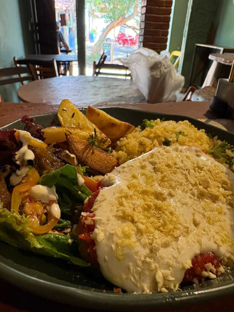 Parmegiana de grão de bico empanada na panko, molho de tomate, creme de castanha de caju, arroz integral com cenoura e couve e abóbora assadaLasanha de espinafre e cogumelo, molho de tomate caseiro, creme de castanha de cajuTorta doce com ganache de chocolate, creme de castanha de caju e geleia de morango ou amora(clique na imagem para ampliar)
